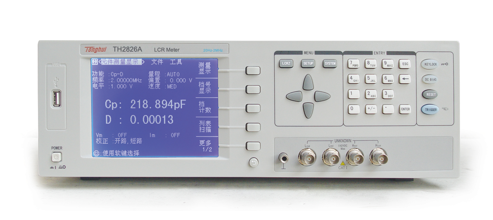 TH2826 系列元件測試儀是符合 LXI 標準的新一代阻抗測試儀器,其 0.1% 的基本精度、 20Hz ~ 5MHz 的頻率范圍可以滿足元件與材料的測量要求,可測量低 ESR 電容器和高 Q 電感器的測量。可用于諸如傳聲器、諧振器、電感器、陶瓷電容器、液晶顯示器、變容二極管、變壓器等進行諸多電氣性能的分析。