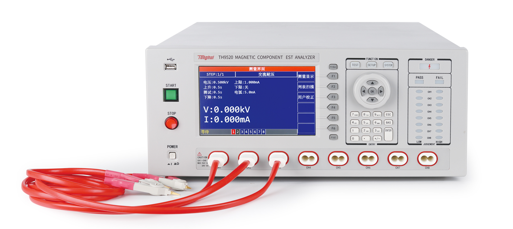 TH9520/A綜合分析系統在單機內實現交流耐壓、直流耐壓、絕緣電阻、匝間絕緣測試、直流低電阻、電感量(TH9520A選配)測試六大功能。針對線圈類元器件需要的測試項目如安規耐壓、匝間絕緣、繞線電阻值、線圈電感量(TH9520A選配),以前需要四臺不同儀器分別進行測試,現在在單機內即可實現。