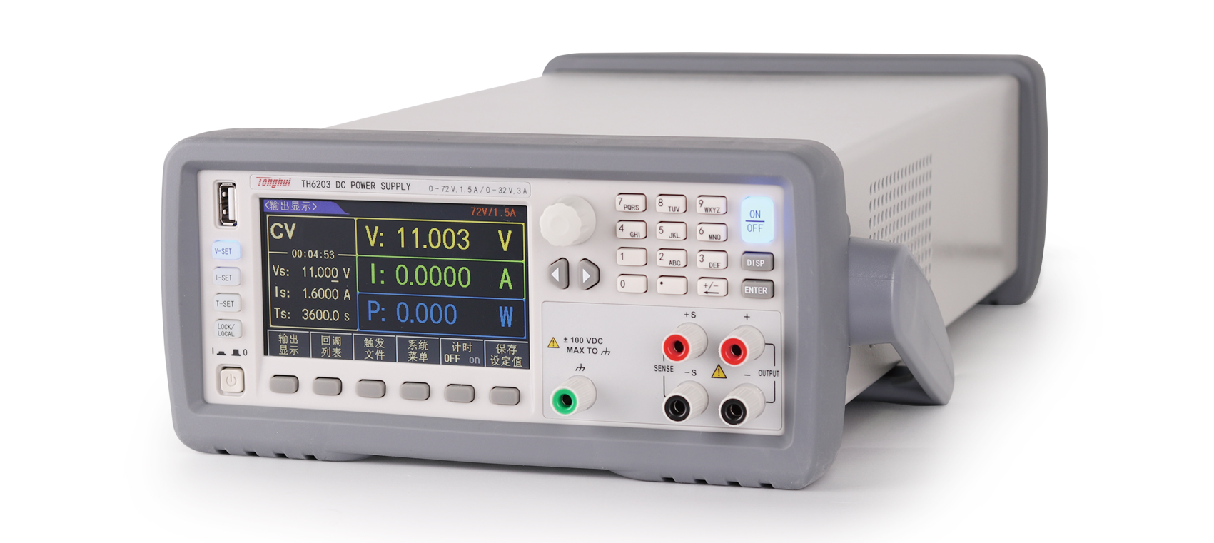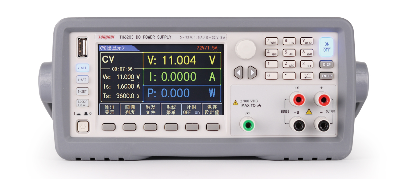 TH6200系列電源前后面板都可以輸出,具有1/2標準機箱尺寸,配備齊全的通訊接口,支持SCPI和MODBUS通訊協議,使其可以方便的集成于自動化系統上。